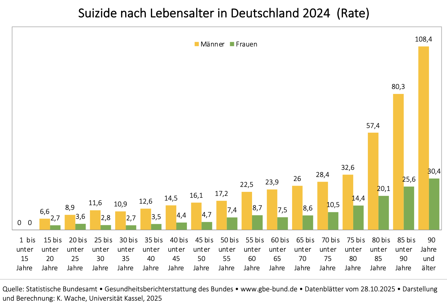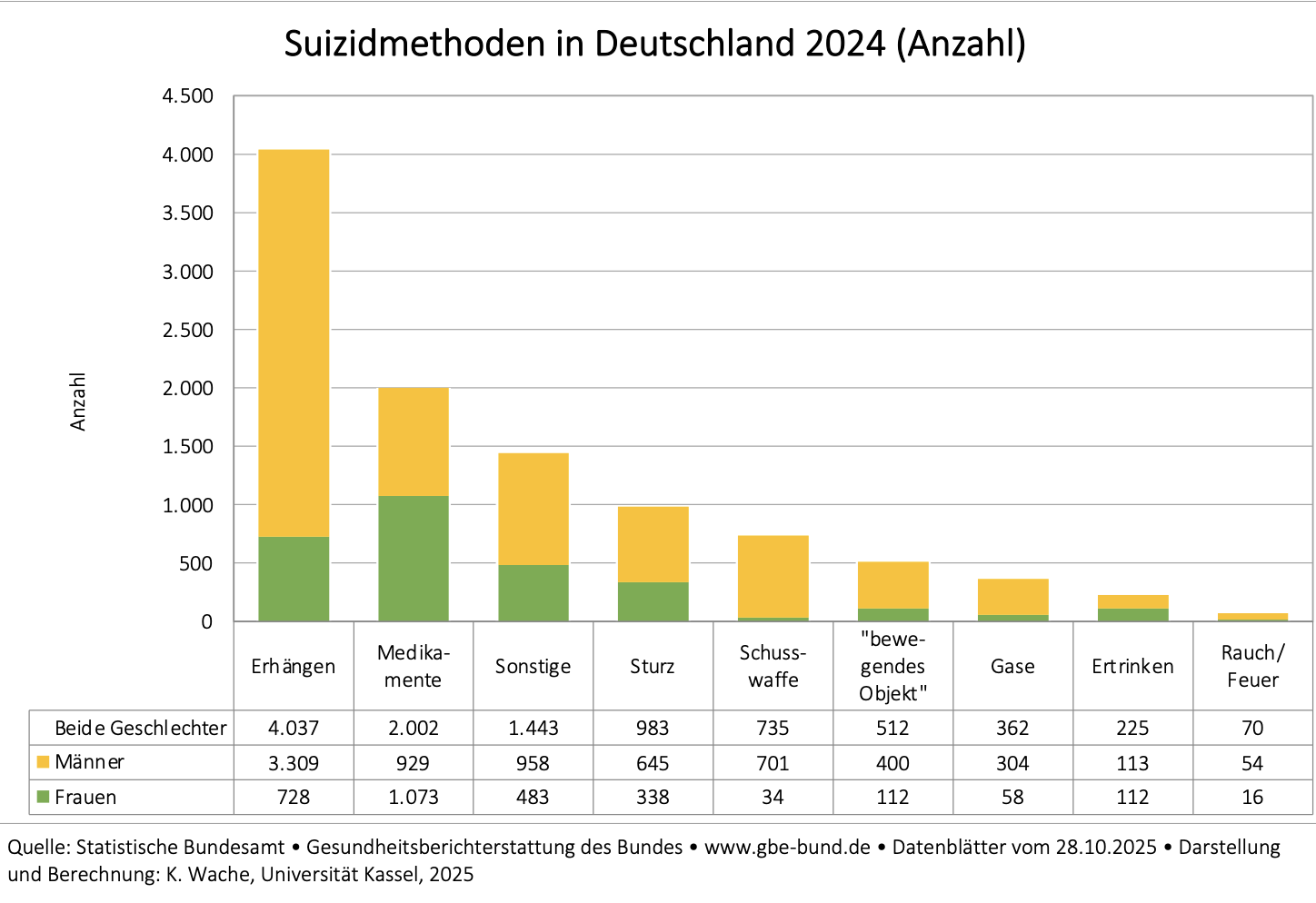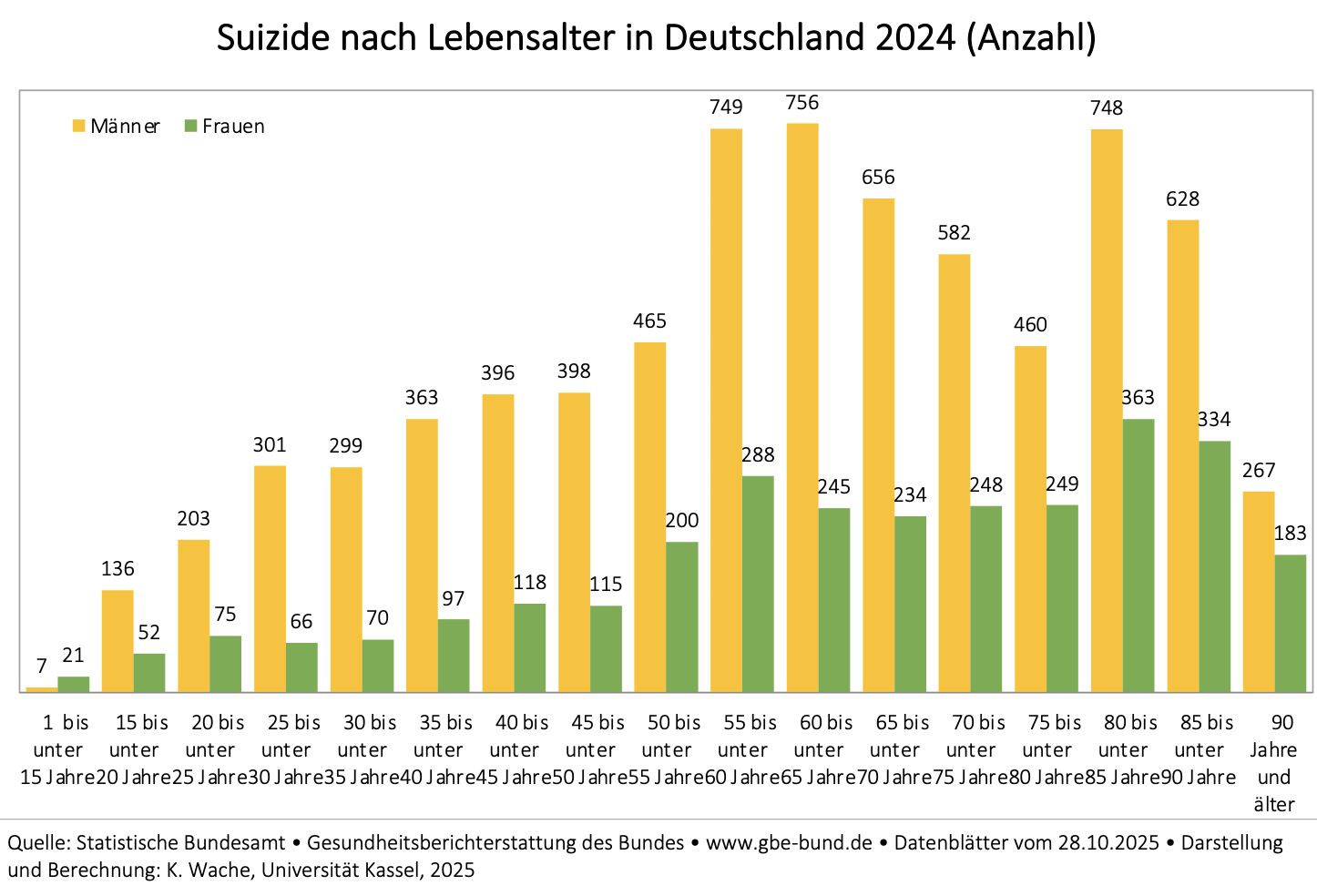 Die folgenden Angaben zu den vollendeten Suiziden 2024 beziehen sich auf die jährlich aktualisierte Todesursachenstatistik des Statistischen Bundesamtes.