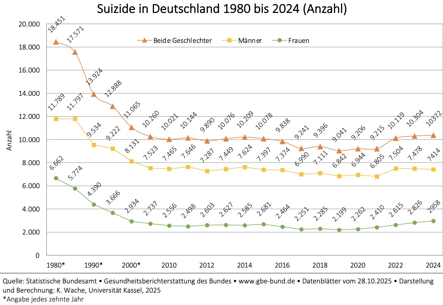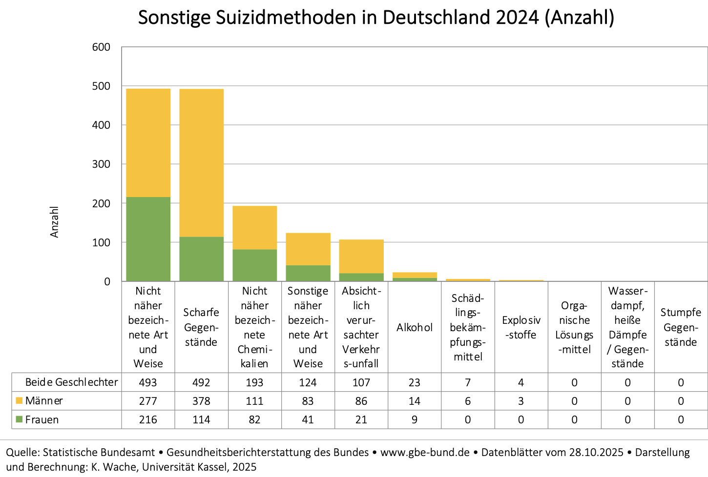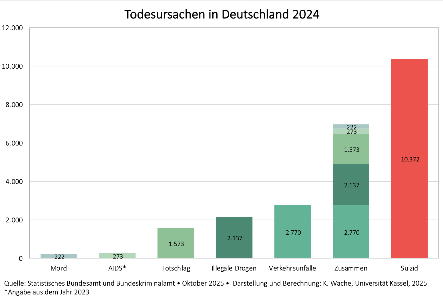 Die folgenden Angaben zu den vollendeten Suiziden 2024 beziehen sich auf die jährlich aktualisierte Todesursachenstatistik des Statistischen Bundesamtes.