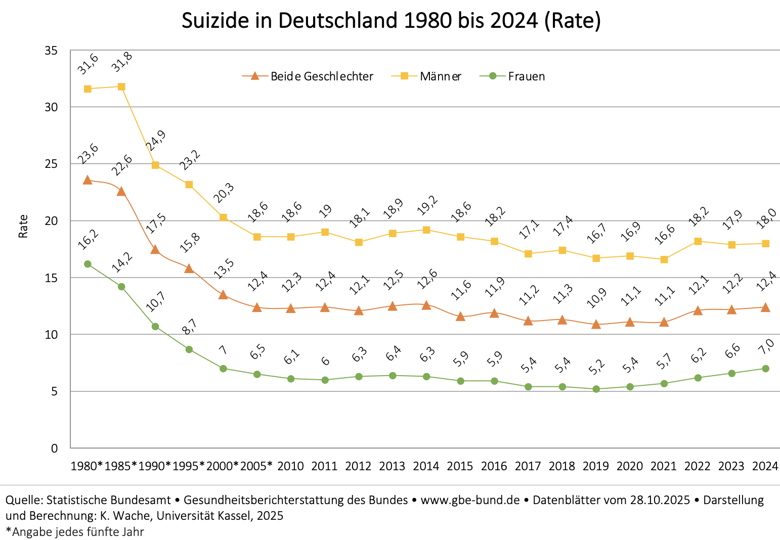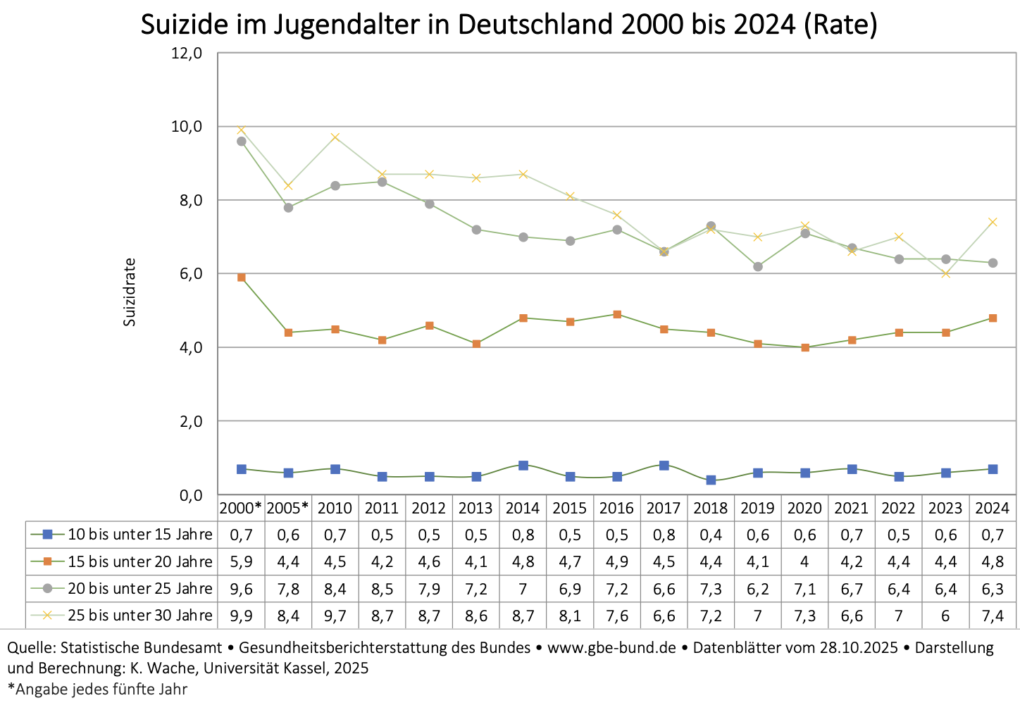 Die Suizidrate ist insgesamt im Jahr 2024 gegenüber dem Wert von 12,2 im Vorjahr auf 12,4 gestiegen. Bei den Frauen stieg die Suizidrate von 6,6 auf 7,0 bei den Männern stieg sie leicht von 17,9 auf 18,0.