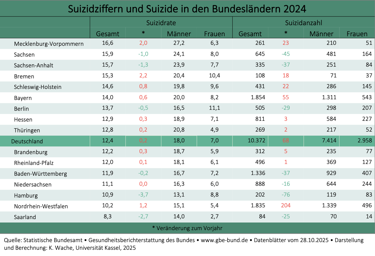 Am stärksten gestiegen ist die Suizidziffer in Bremen (+2,2) und Mecklenburg-Vorpommern (+2,0). Das Saarland (8,3) und Nordrhein-Westfalen (10,2) haben die niedrigste Suizidziffer. In fünf Bundesländern gab es einen Rückgang der Suizidziffer. Berlin hat die höchste Suizidziffer bei Frauen (11,1) und Mecklenburg-Vorpommern bei Männern (27,2).