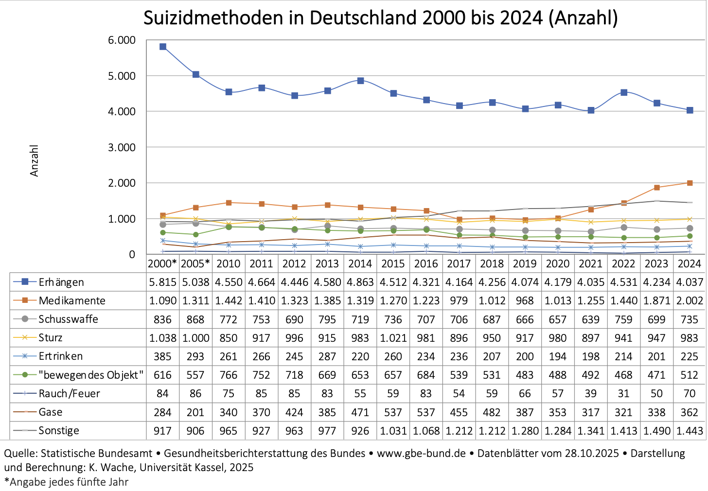 Auffällig ist der annähernde Verdoppelung der Suizide durch Medikamente seit 2020 um 98% von 1.013 auf 2.002 Fälle. Der Anstieg lässt sich überwiegend auf die „Vorsätzliche Selbstvergiftung durch und Exposition gegenüber sonstige(n) und nicht näher bezeichnete(n) Arzneimittel(n), Drogen und biologisch aktive(n) Substanzen“ zurückführen.