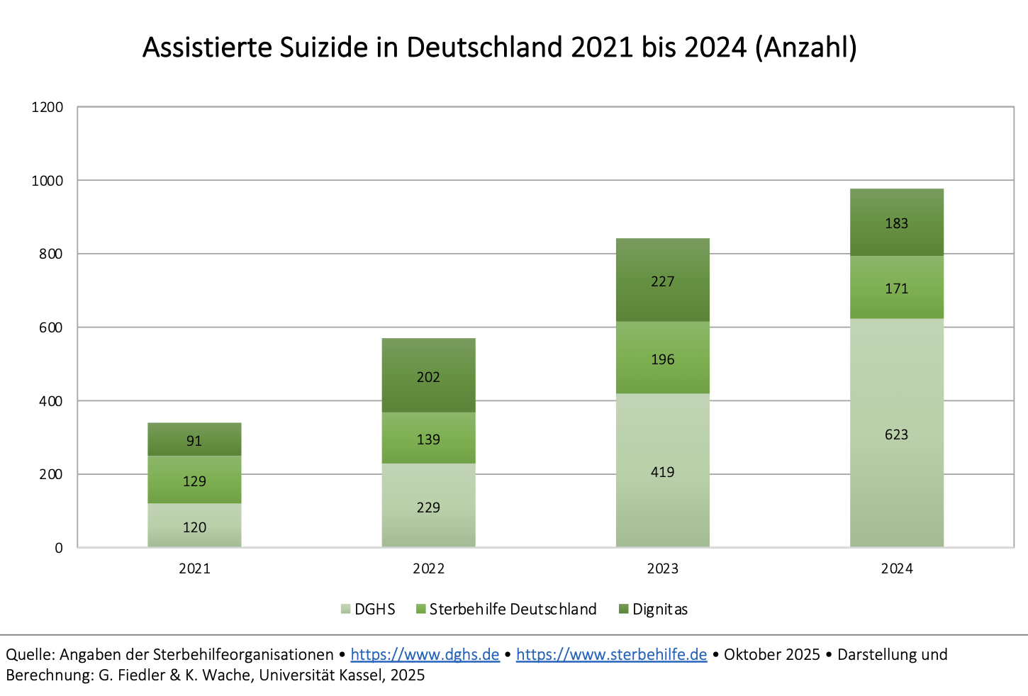 Assistierte Suizide werden vom Statistischen Bundesamt nicht gesondert ausgewiesen. Deshalb sind hier die Angaben von drei Vereinen, die assistierten Suizide anbieten, aufgeführt. Demnach stieg die Anzahl der assistierten Suizide von 340 Fällen im Jahr 2021 auf 977 Fälle im Jahr 2024 um 287 %. Da nicht alle Anbieter von Suizidassistenzen Daten veröffentlichen und auch die Datenqualität unbekannt ist, dürfte die Zahl der assistierten Suizide insgesamt deutlich höher liegen. Jedoch geben die vorhandenen Daten einen Eindruck von der Zunahme der Fälle von begleiteter Selbsttötung. Aufgrund der vorliegenden Daten können wir davon ausgehen, dass derzeit mehr als jeder zehnte Suizid mit Assistenz einer anderen Person erfolgt.