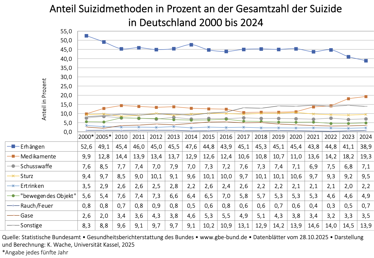 Fast jeder fünfte Suizid wird mittlerweile durch Medikamente begangen. Der Anteil der jeweiligen Suizidmethoden an der Gesamtzahl der Suizide ist in den letzten 20 Jahren relativ stabil geblieben. Die Verringerung des Anteils des Erhängens an der Gesamtzahl der Suizide sollte nicht vorschnell interpretiert werden. In absoluten Zahlen liegt die Methode des Erhängens innerhalb der Schwankungsbreite der letzten Jahre. Sollte jedoch die Anzahl der Suizide durch assistierte Suizide steigen, würde dies statistisch den Anteil anderer Methoden wie z. B. des Erhängens verringern.