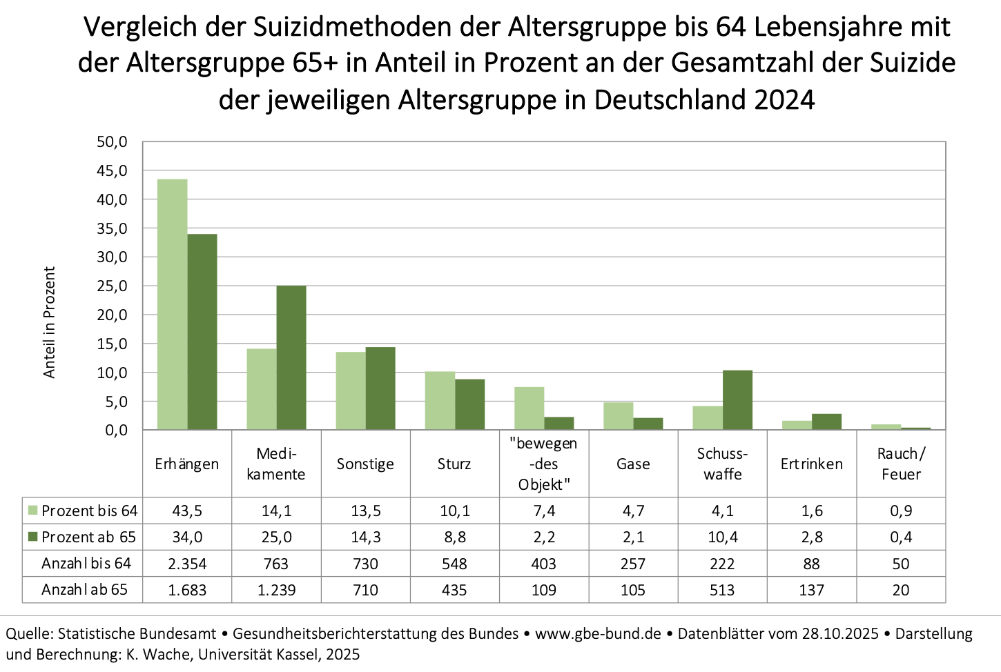 Bei den bis zu 64-Jährigen ist Erhängen ebenfalls die dominierende Methode, jedoch sterben Jüngere darüber hinaus häufiger durch Gase oder auf Bahngleisen.